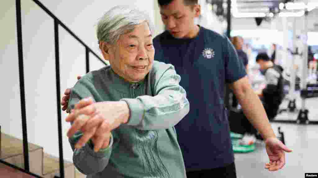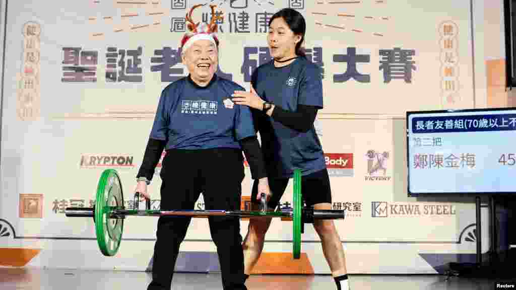 তাইওয়ানে এক ভার-উত্তোলন প্রতিযোগিতায় অনায়াসে ৩৫ কিলোগ্রাম বার তুলেছেন ৯০ বছর বয়সী চেং চেন চিন-মেই। এই দৃশ্য দেখে উচ্ছ্বাসে ফেটে পড়েন উপস্থিত জনতা। শনিবার, ২১ ডিসেম্বর।