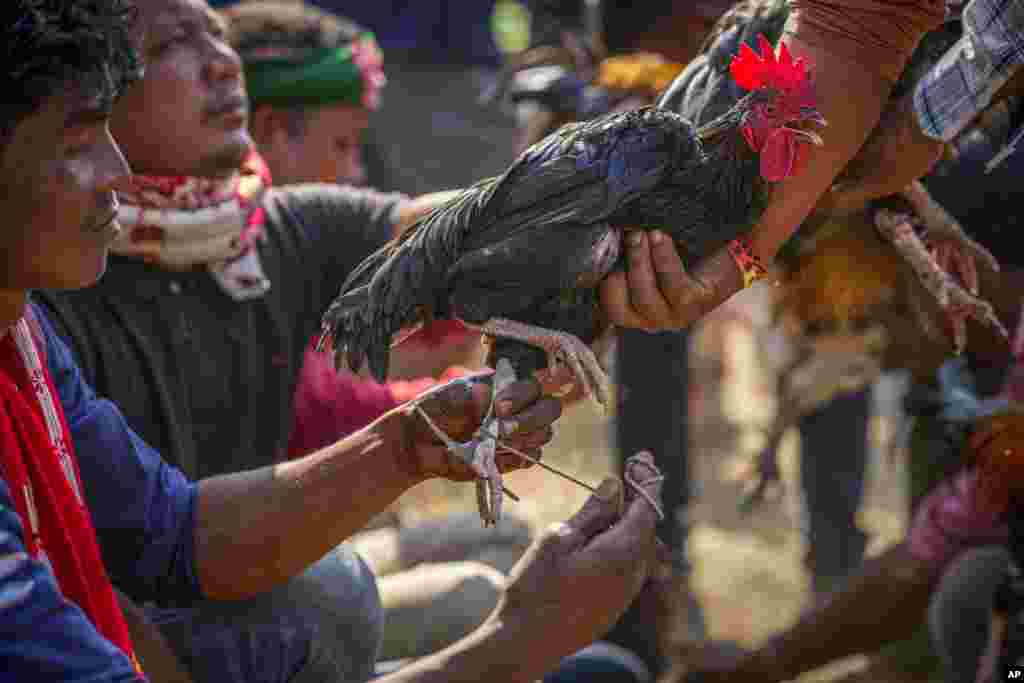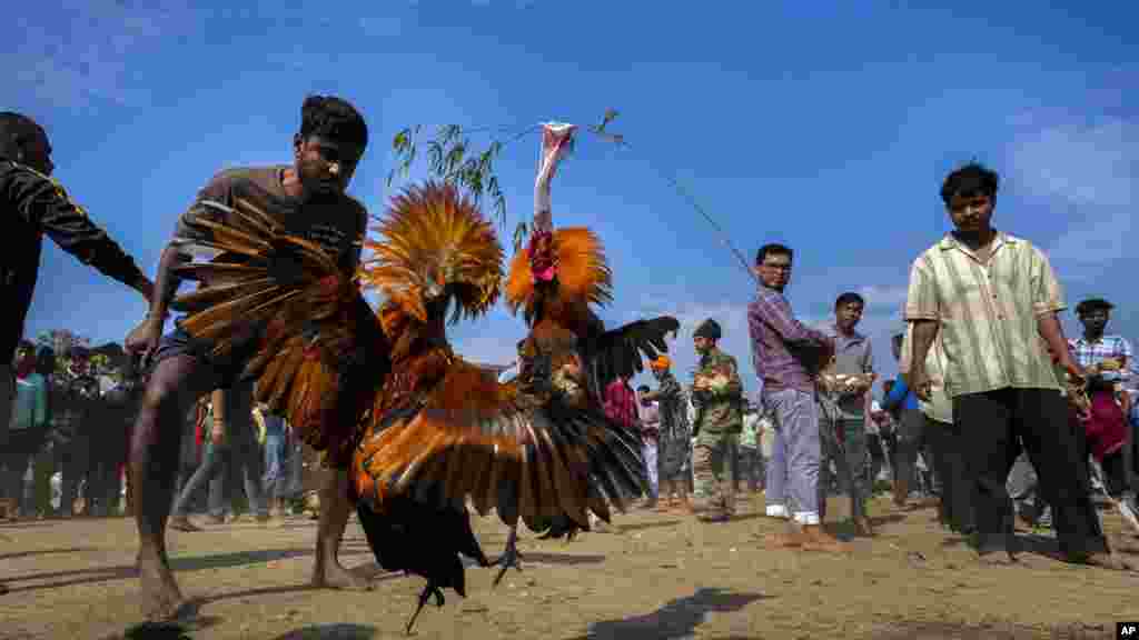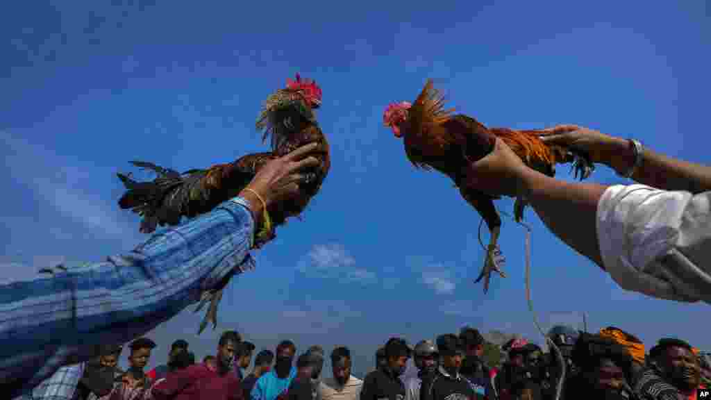 ভারতের জাগিরোডের কাছে জনবিল উৎসবের অংশ হিসেবে মোরগ-লড়াইয়ের আয়োজন করা হয়; সেখানে মোরগরা একে অপরকে আক্রমণ করে। শুক্রবার, ১৭ জানুয়ারি।