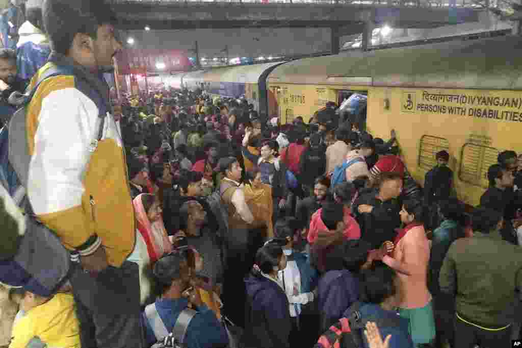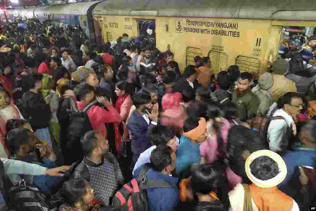 ছবিতে ভারতের রাজধানী নয়াদিল্লির একটি রেলওয়ে স্টেশনে ট্রেনে ওঠার আগে যাত্রীদের একে অপরের সঙ্গে ধাক্কাধাক্কি করতে দেখা যাচ্ছে। শনিবার, ১৫ ফেব্রুয়ারি, ২০২৫।