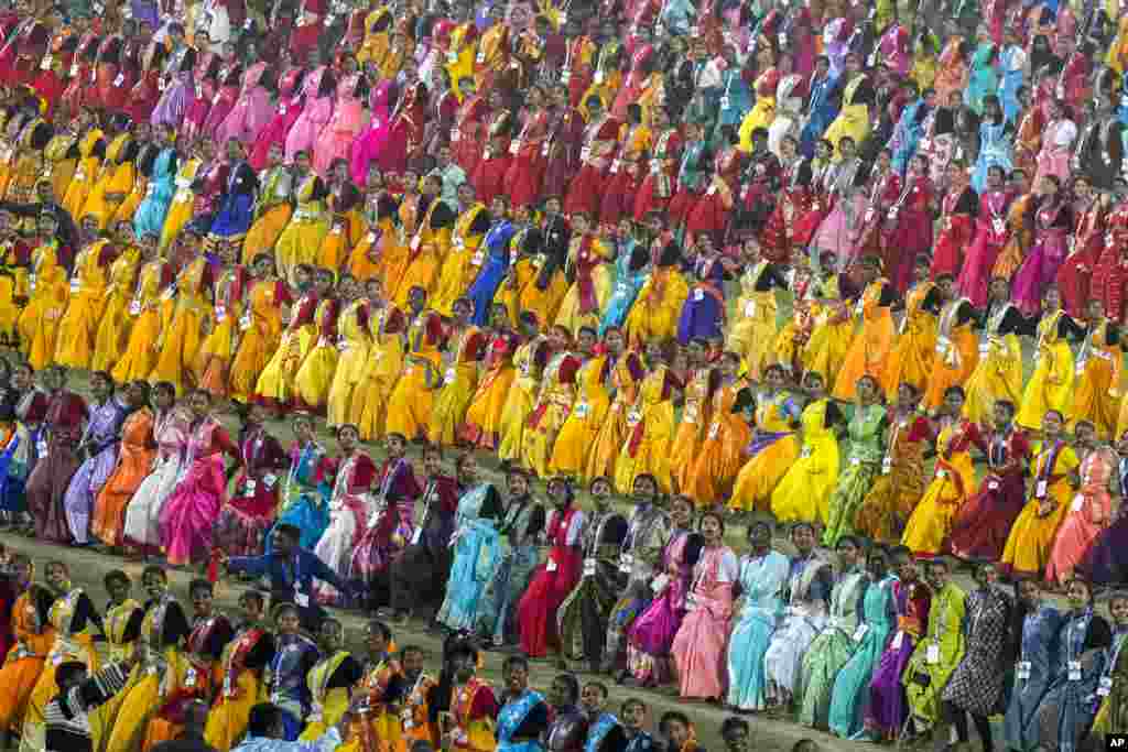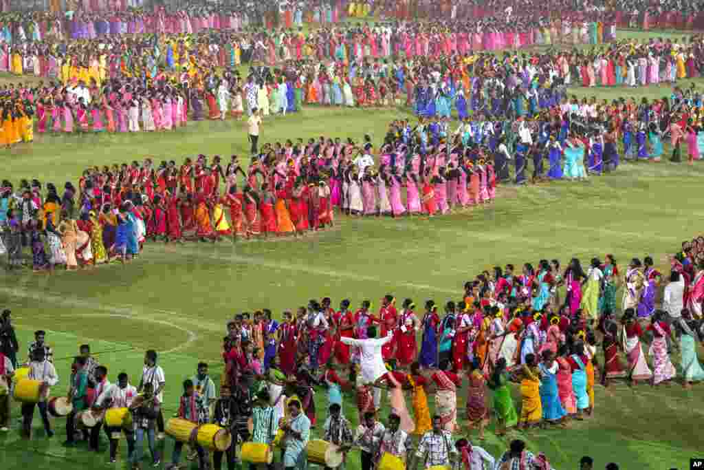 বিশ্ব রেকর্ড তৈরির চেষ্টায় ভারতের গুয়াহাটিতে আয়োজিত হতে চলা এক নৃত্যানুষ্ঠানের দুই দিন আগে মহড়ার সময় আদিবাসী তরুণ-তরুণীরা ঝুমুর নাচ পরিবেশন করছেন। শনিবার, ২২ ফেব্রুয়ারি, ২০২৫।