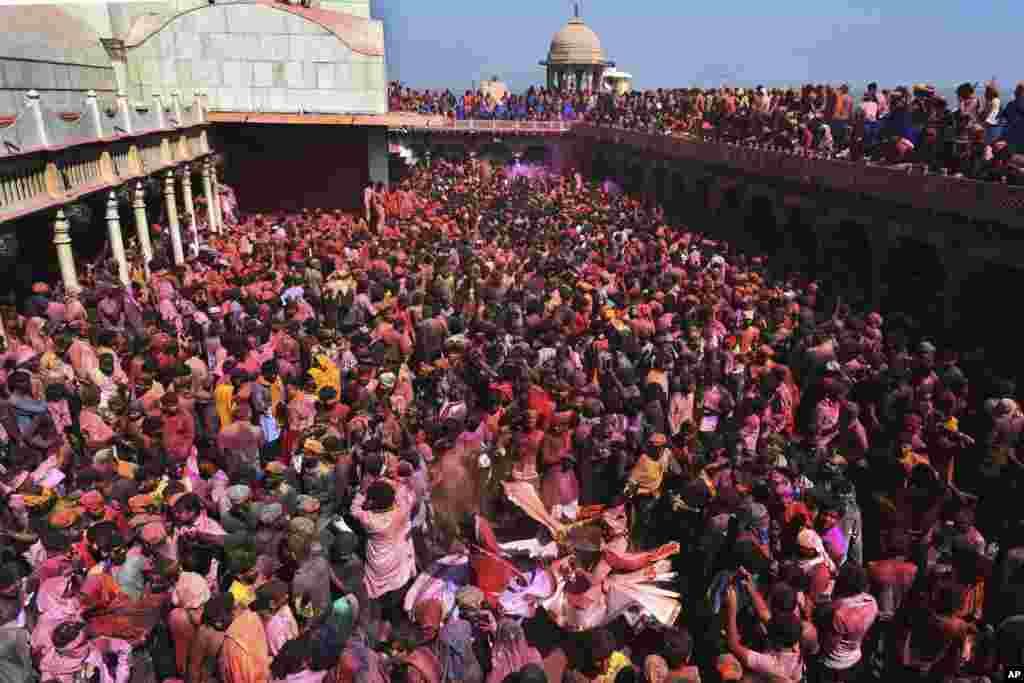 ছবিতে ভারতের নয়াদিল্লি থেকে ৭০ মাইল দক্ষিণে অবস্থিত বরসানা এবং নন্দগাঁওয়ের গ্রামবাসীদের নন্দগ্রাম মন্দিরে হোলি উৎসবে অংশ নিতে দেখা যাচ্ছে। রবিবার, ৯ মার্চ, ২০২৫।